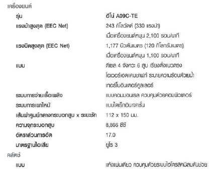 -เครื่องยนต์ HINO A09C-TE 330 แรงม้า เครื่องดีเซล 4 จังหวะ 6 สูบ เรียงตั้งแนวตรง ระบายความร้อนด้วยน้ำเทอร์โบอินเตอร์คูลเลอร์