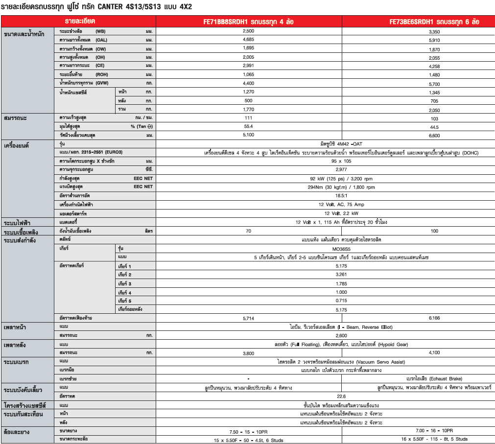 ความทรงพลัง ที่มาพร้อมรูปทรงทันสมัย สุดยอดพลังบรรทุก คล่องตัวทุกการเคลื่อนไหว แนวคิดใหม่… ถ่ายทอดสู่รถบรรทุก ขนาดเบาที่เปี่ยม คุณภาพในทุกเส้นทางการบรรทุก ฟูโซ่ แคนเตอร์ขนาดเล็ก 4 ล้อ และ 6 ล้อ 125 แรงม้า แข็งแรงเต็มพลัง เพื่อการใช้งานที่คุ้มค่า เต็มประสิทธิภาพทุกรูปแบบงานบรรทุก